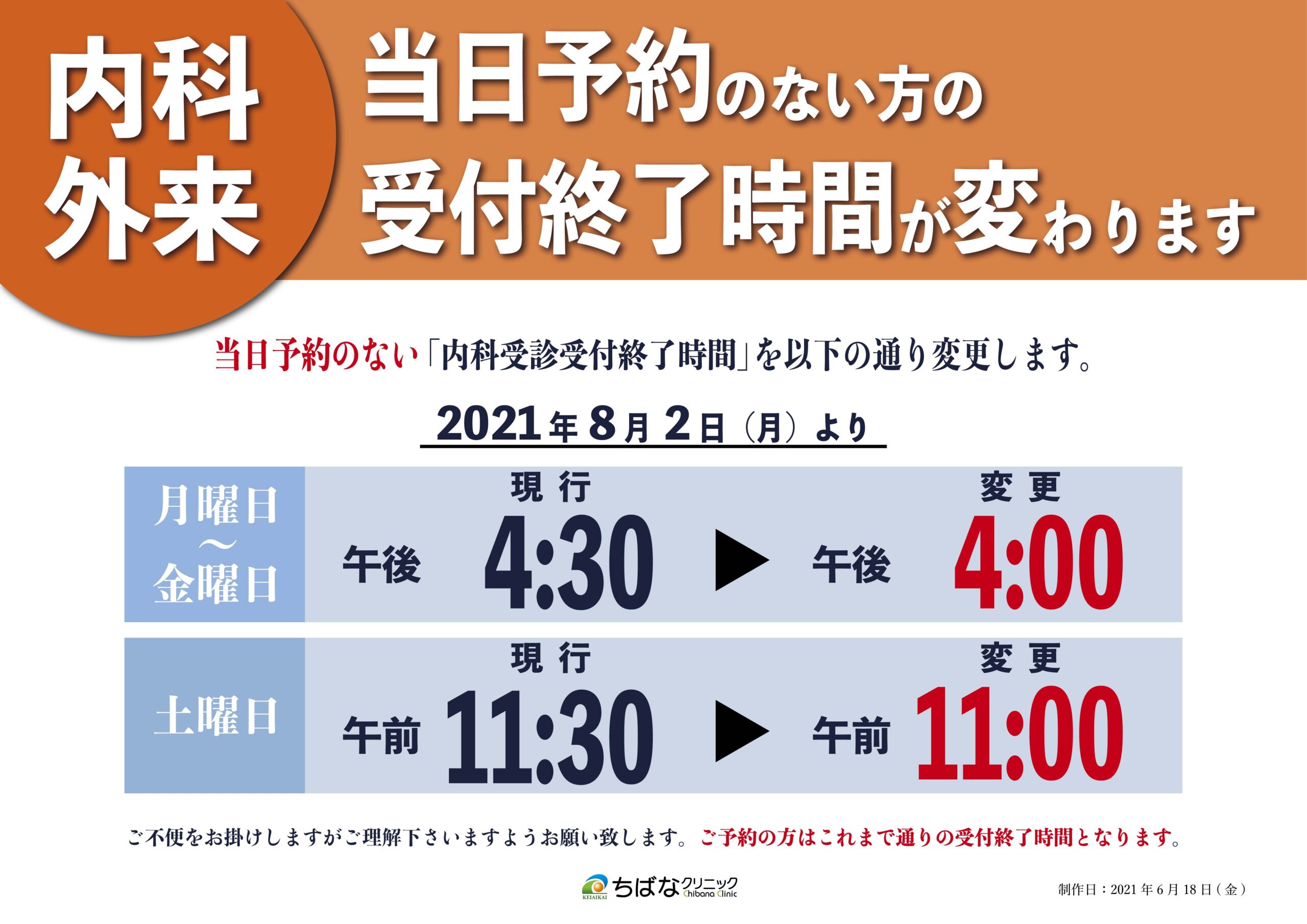 2021年8月2日(月)より当日予約のない「内科受診受付終了時間」を以下の通り変更します。みなさまにはご不便をお掛けしますが、ご理解下さいますようお願い致します。なお、ご予約の方はこれまで通りの受付終了時間となります。