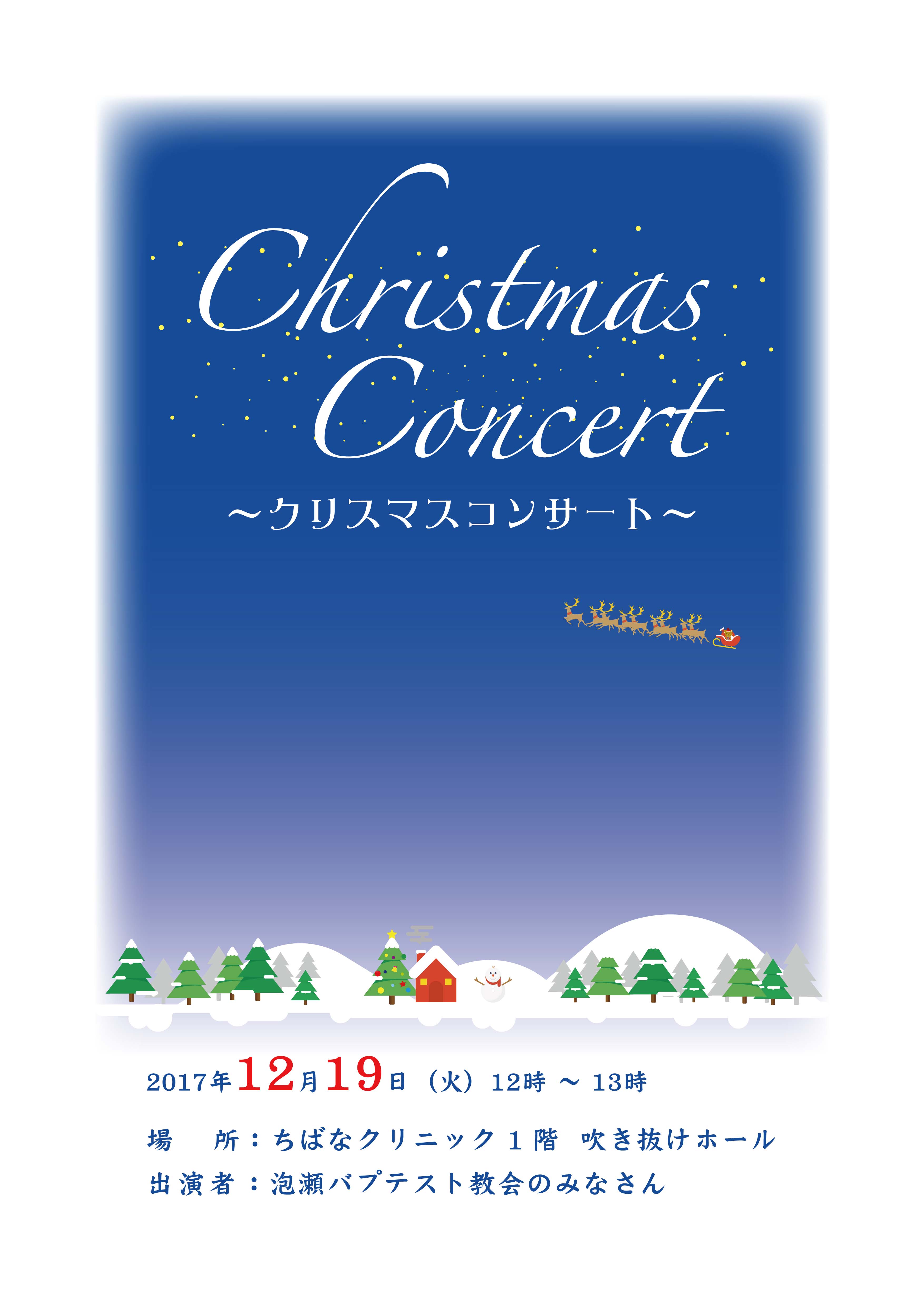 日 時:2017年12月19日(火) 12:00〜13:00 場 所:ちばなクリニック1階ホール 出 演:泡瀬バプテスト教会のみなさん 内 容:クリスマスの歌と楽器演奏を行います。