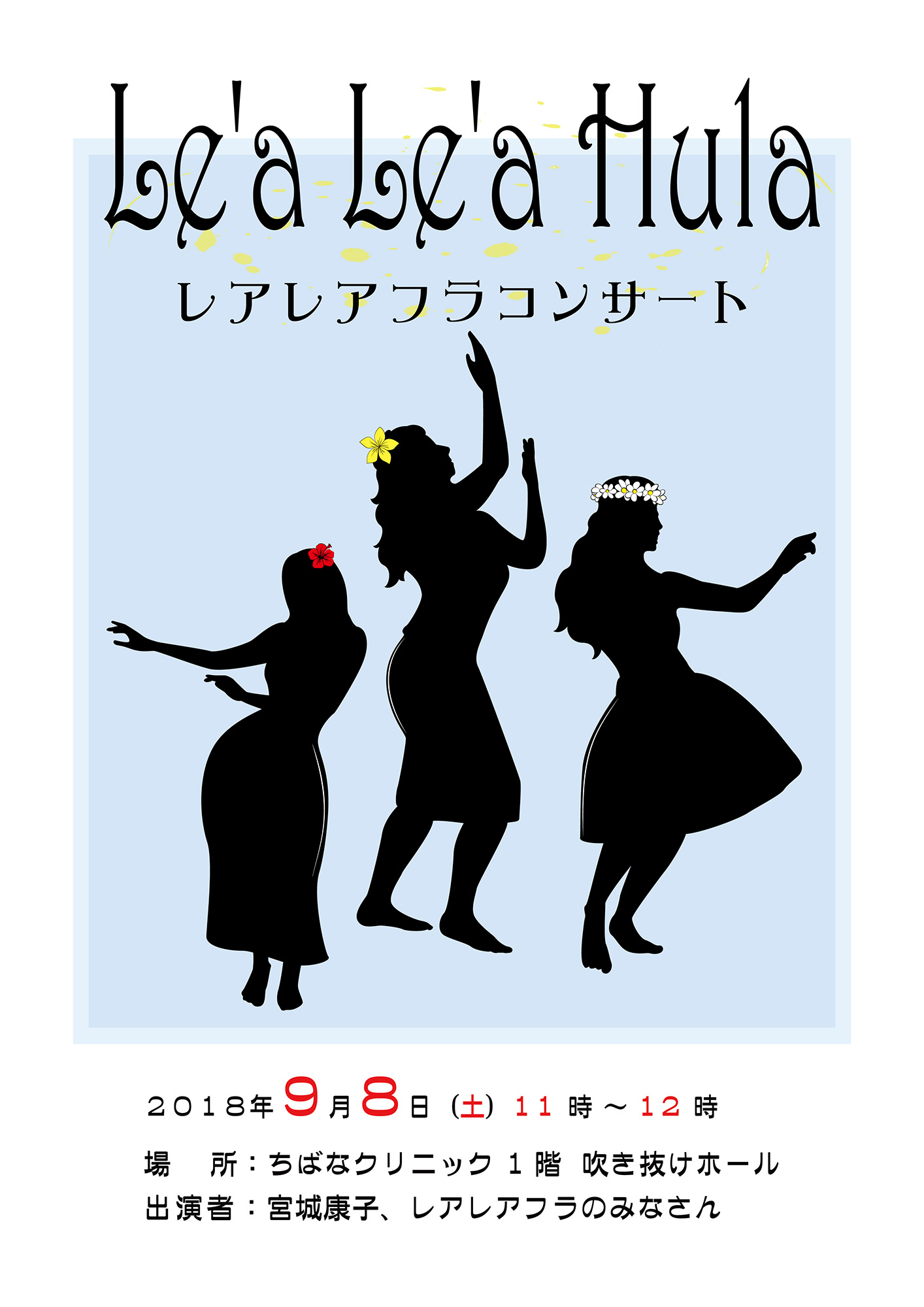 日 時:2018年9月8日(土) 11:00〜12:00 場 所:ちばなクリニック1階ホール 出 演:宮城康子、レアレアフラのみなさん 内 容:フラコンサート