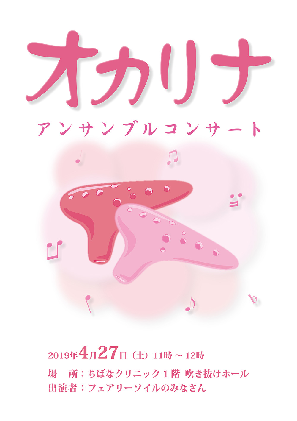 日 時:2019年4月27日(土) 11:00〜12:00 場 所:ちばなクリニック1階ホール 出 演:フェアリーソイルのみなさん 内 容:オカリナ演奏