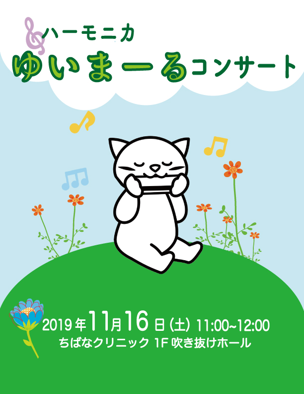 日 時:2019年11月16日(土) 11:00〜12:00 場 所:ちばなクリニック1階ホール 出 演:ハーモニカサークル「ゆいまーるの会」のみなさん 内 容:ハーモニカ演奏