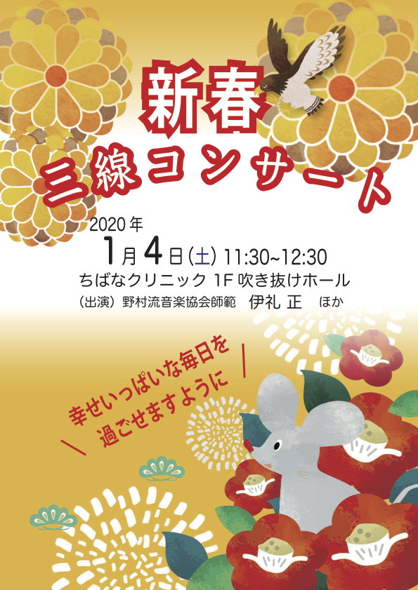 日 時:2020年1月4日(土) 11:30〜12:30 場 所:ちばなクリニック1階ホール 出 演:今年も野村流音楽師範 伊礼正さん 他 内 容:琉球民謡・古典音楽など