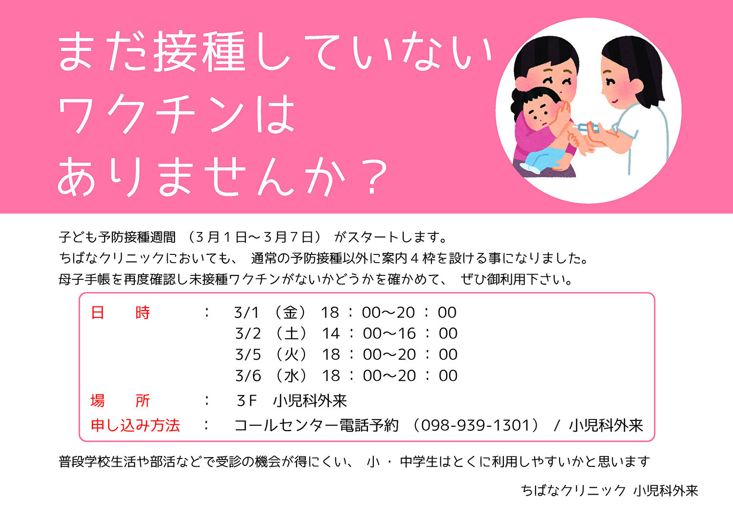 ちばなクリニックでは、この「子ども予防接種週間」に通常の予防接種枠以外に4枠を追加します。普段は学校や部活等で受診の機会が得にくい小学生・中学生に利用しやすくなっています。