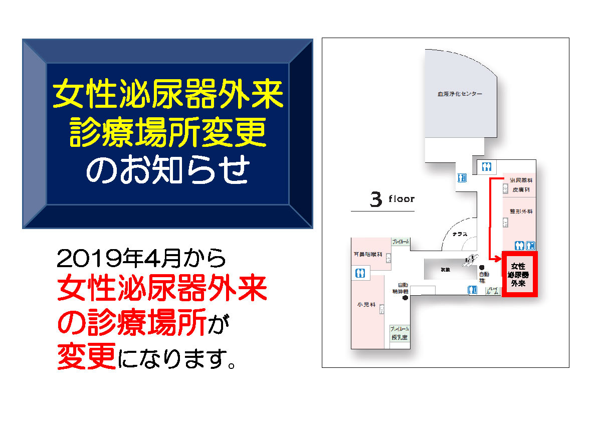 来月4月1日(月)から女性泌尿器外来の診療場所が変更になります。新しい場所については右の画像をクリックしてご確認ください。