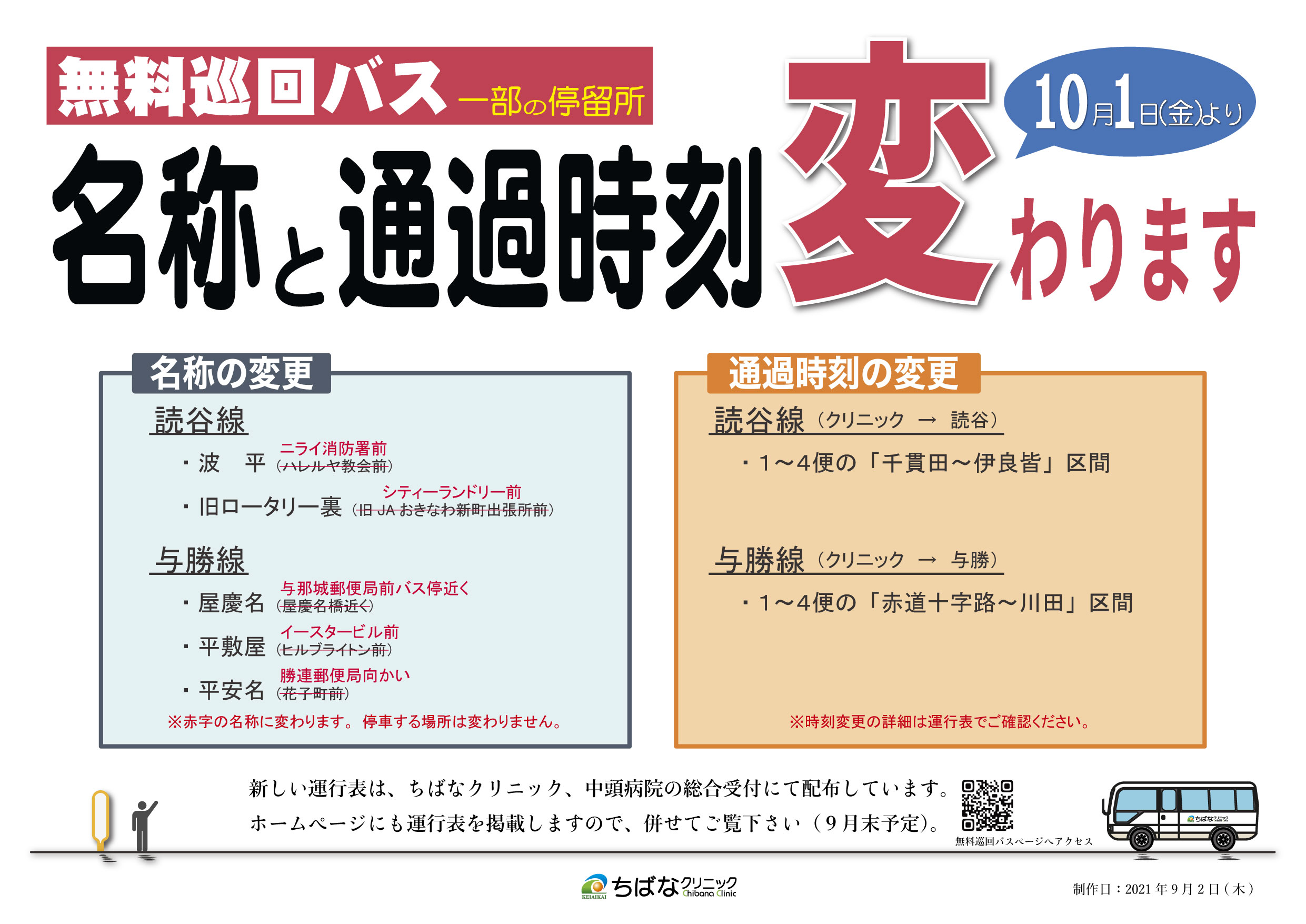 2021年10月1日(金)から無料巡回バスの一部の停留所名と通過時刻が変わります(停留所の場所は変わりません)。新しい運行表は、ちばなクリニック、中頭病院の総合受付にて配布しています。ホームページの運行表は以下をご覧下さい。