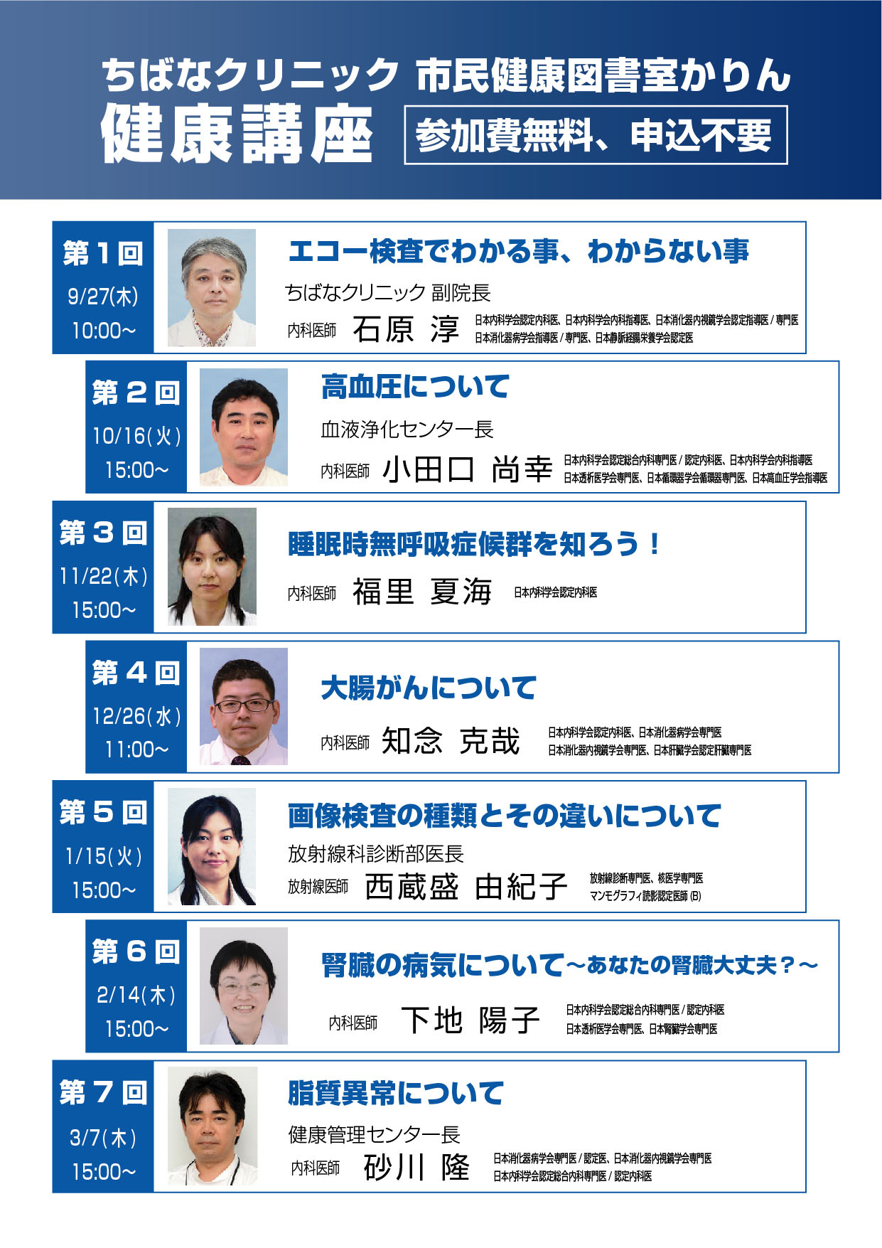 ちばなクリニックでは、市民健康図書室かりんのリニューアルオープンを記念して「健康講座」を開催しています。今月は「腎臓の病気について~あなたの腎臓大丈夫?~」と題して、当クリニック内科医師の下地医師を講師にお話します。病気や健康について、みなさまと共に考え健康目標への道案内が出来ればと思います。参加費無料、申込不要です。どうぞお気軽にご参加下さい。