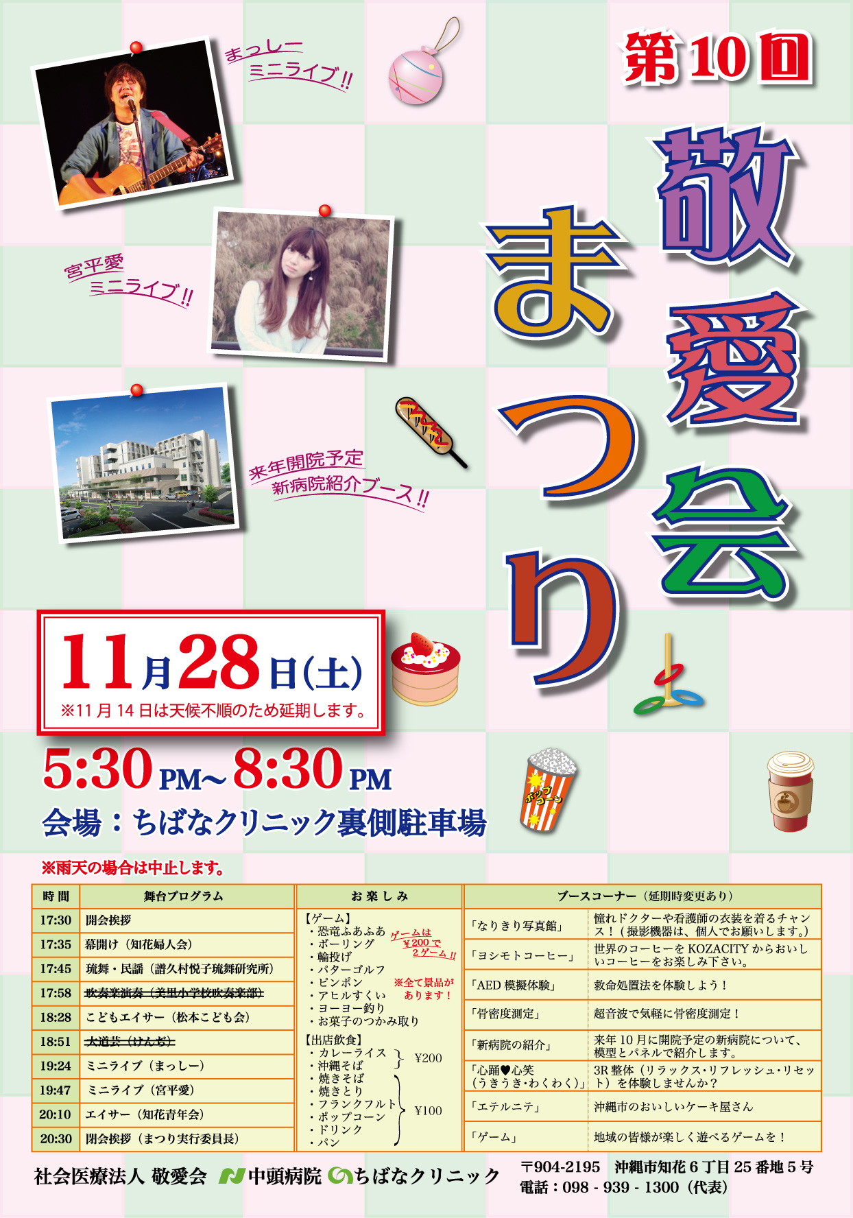 11月14日(土)に予定していました敬愛会まつりは、天候不順が予想されるため、11月28日(土)に延期します。なお延期に伴い一部プログラムの変更があります(左画像でご確認下さい)。