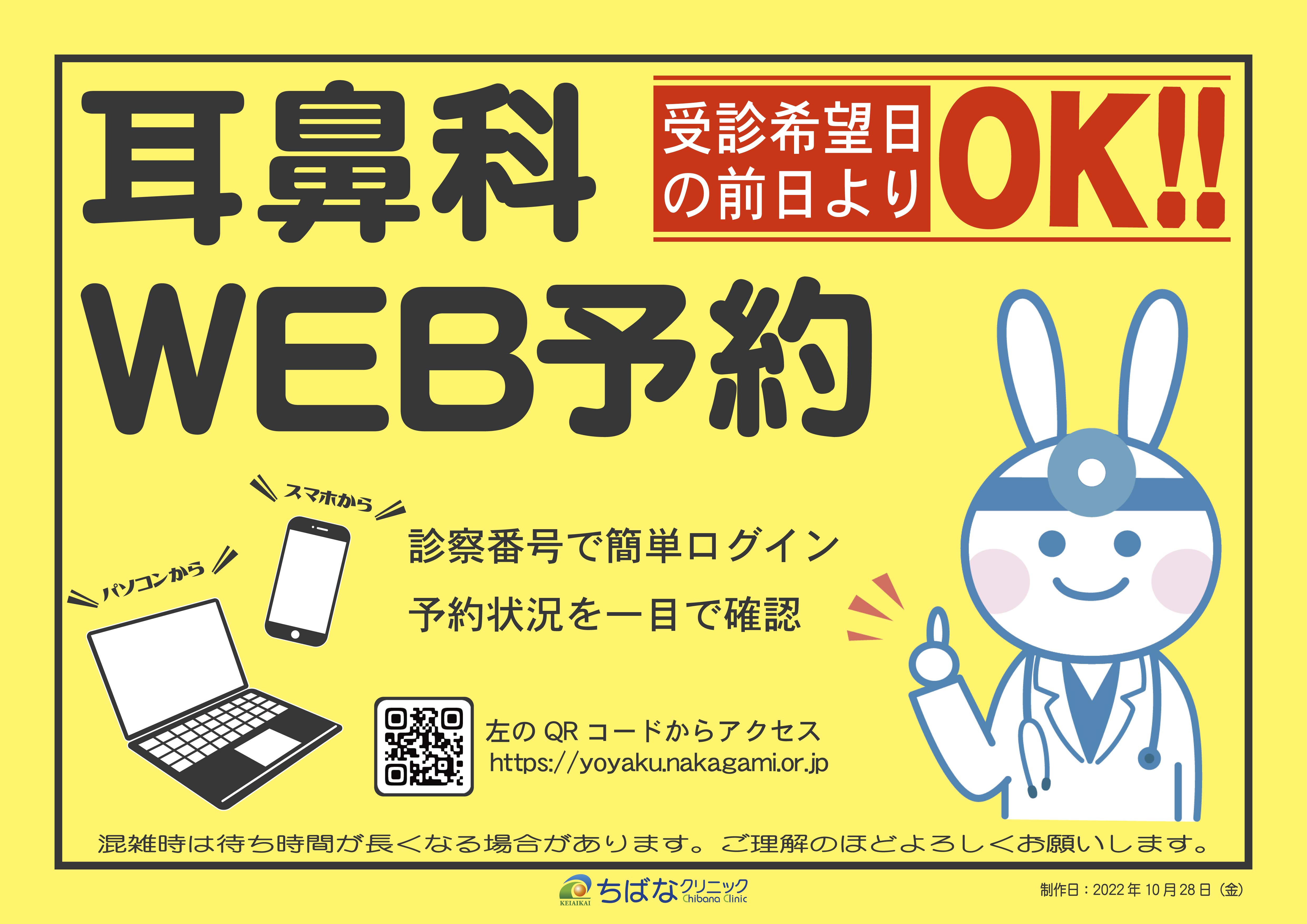 新型コロナウイルス感染症蔓延のため2022年2月3日(木)から停止していた耳鼻科のWeb予約について、2022年11月1日(火)より再開いたします。