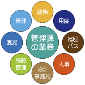 - 管理課では、下記の業務内容にあるように院内のことはもちろんのこと、ちばなクリニックのフェイスブック業務や健康講座の運営・広報対応など院外への情報発信の役割も担っており、業務は多岐にわたります。そのなかで、他部署の職員をはじめ、関わる人が気持ちよく仕事ができるよう臨機応変な対応を心掛けています。